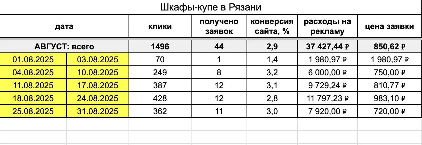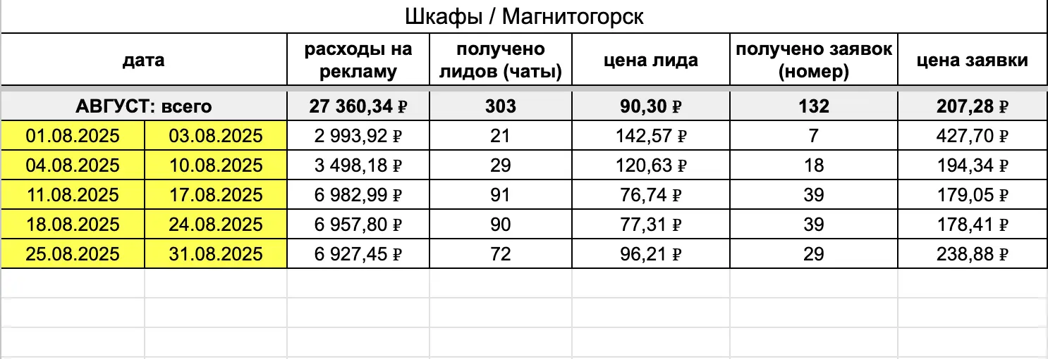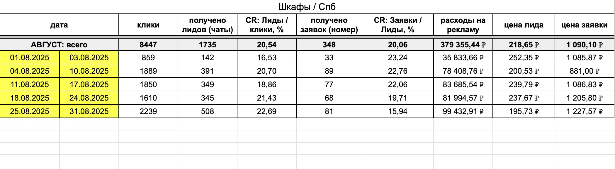 Каждую неделю вы получаете детальную статистику в Google-таблице: количество заявок на шкафы, цена лида, расход бюджета. Всё ясно и максимально прозрачно
